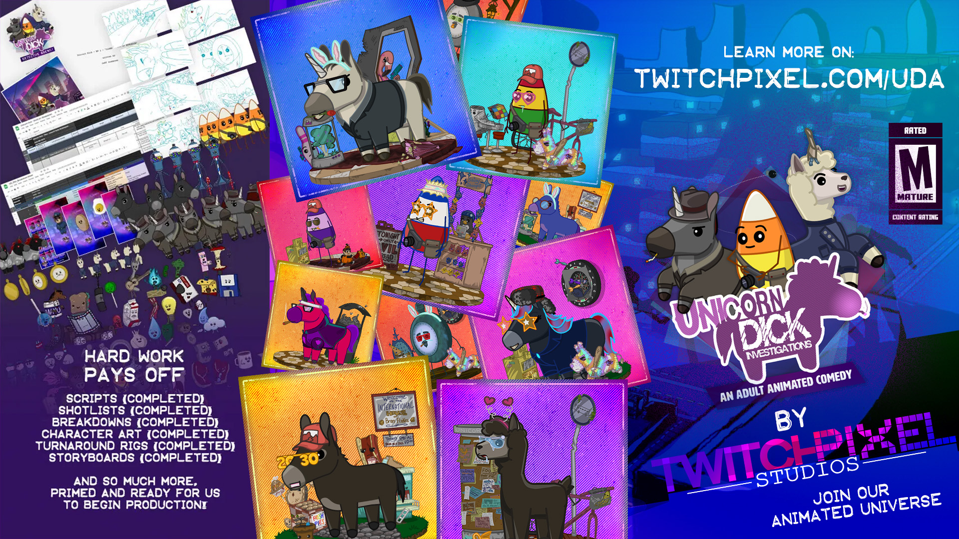 Like a twisted lovechild between Rick & Morty and Adventure Time, the adbsurd and adorable world of Unicorn Dick (shorhand for detective) Investigations is on the case!