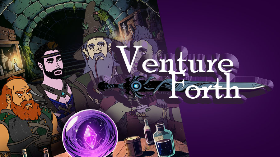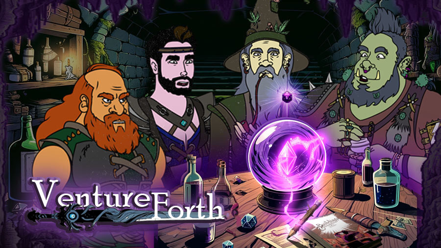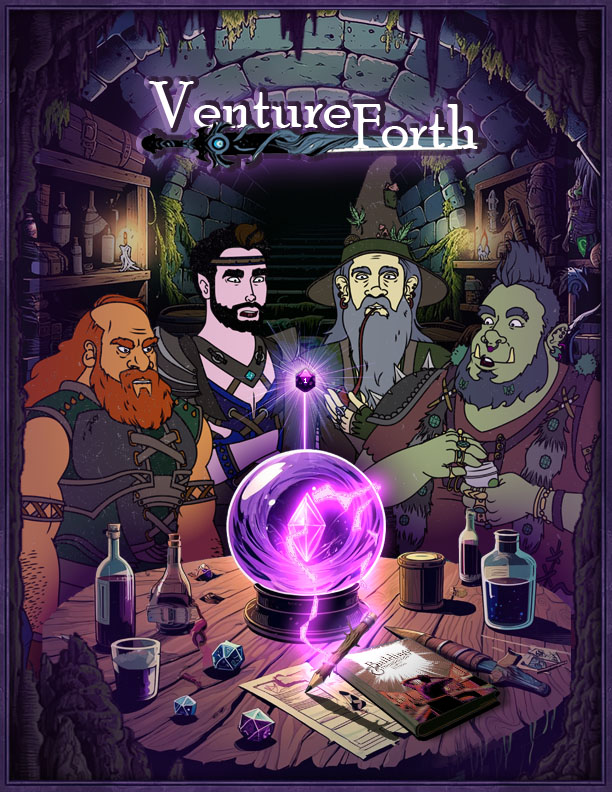In "Venture Forth" medieval characters hilariously navigate a tabletop RPG called "Buildings & Bureaucrats" set in our modern world, where they roll dice to tackle everything from evading taxes to commuting in smog-filled streets. Guided by a Dungeon Master from a mystical crystal ball, their mishaps and adventures are filled with challenges like job interviews and Black Friday sales, battleing rich CEOs and cab drivers.